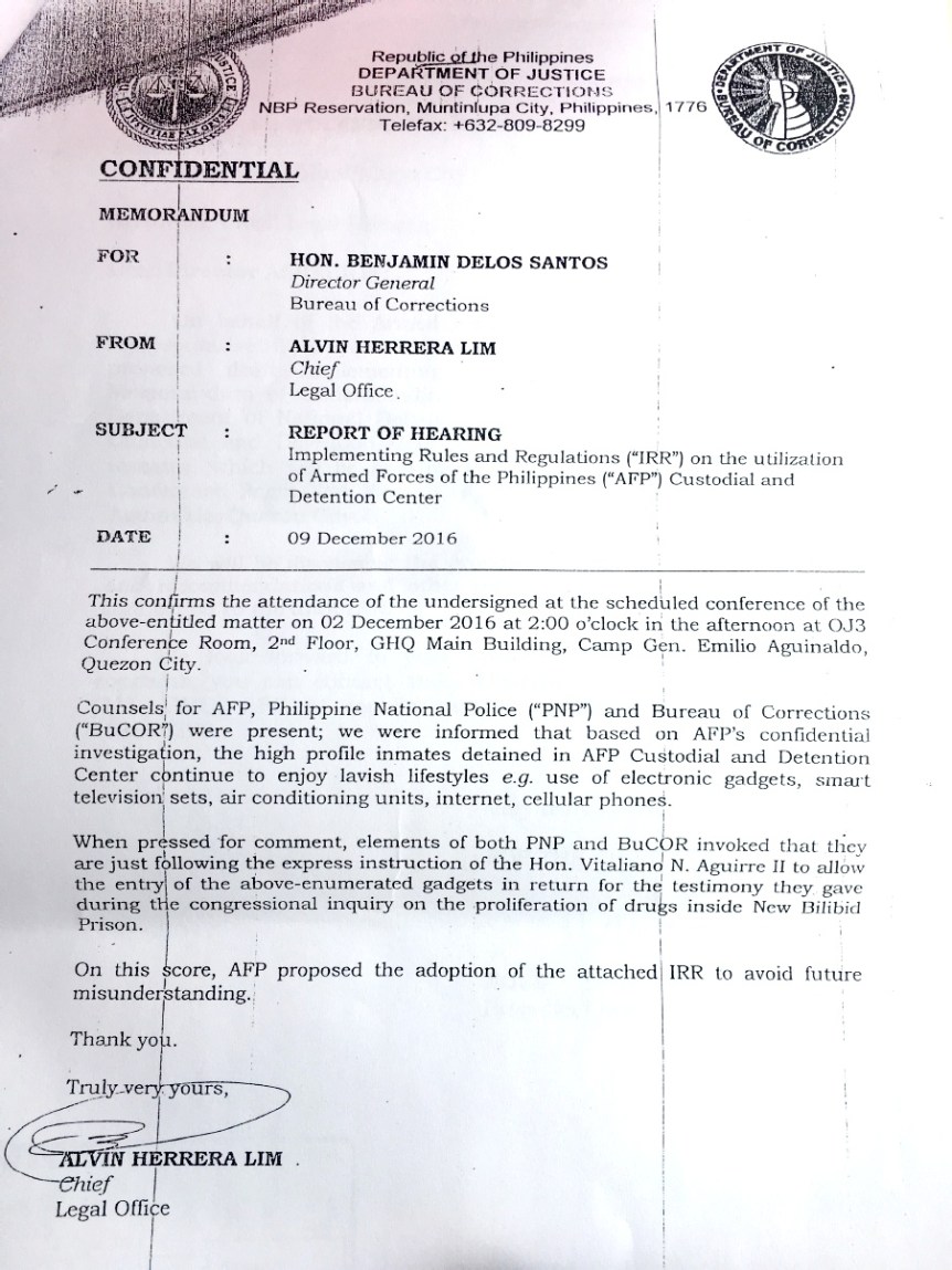 “When pressed for comment, elements of both PNP and BuCor invoked that they are just following the express instruction of the Honorable Vitaliano N. Aguirre to allow the entry of the above enumerated gadgets in return for the testimony they gave during the Congressional inquiry on the proliferation of drugs inside the new Bilibid prison.”