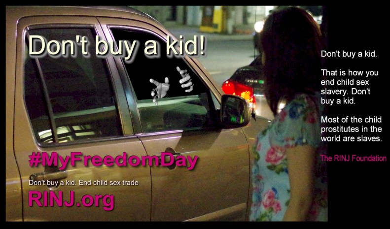 The RINJ Foundation “Don’t Buy A Kid” campaign is in its fifth year. This March 14, 2017, #MYFreedomDay, RINJ reminds our sisters around the world that human sex trafficking is the most common form of modern-day slavery. Estimates place the number of its domestic and international victims in the millions, mostly females and children enslaved in the commercial sex industry for little or no money.